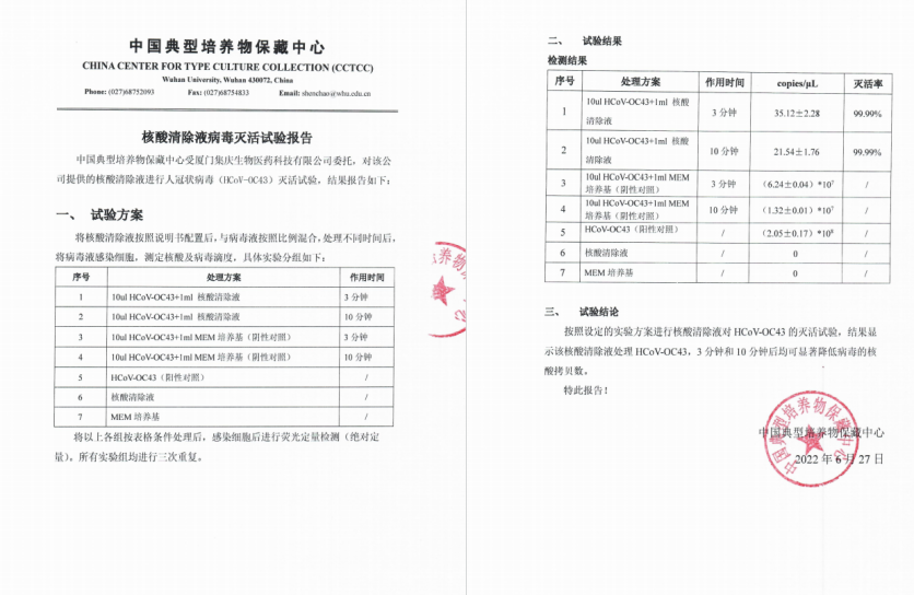 芯創核酸清除液,擁有獨家裂解核苷酸的技術,能通過破壞核糖核酸(RNA)的化學鍵以達到裂解核苷酸,徹底破壞病毒遺傳物質結構,殺死病毒的效果。本產品通過了中國典型培養物保藏中心病毒滅活試驗,病毒滅活率高達99.99%。